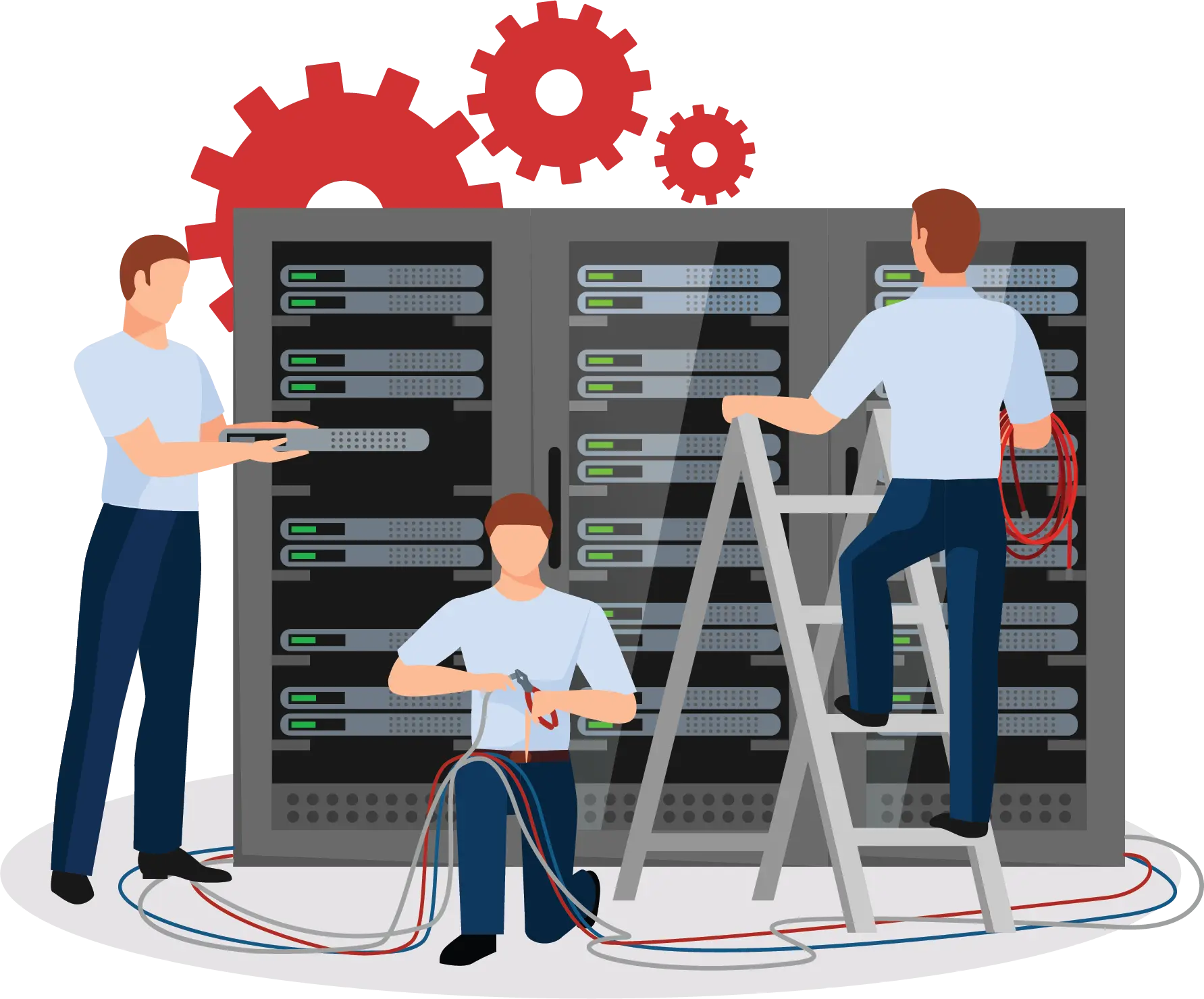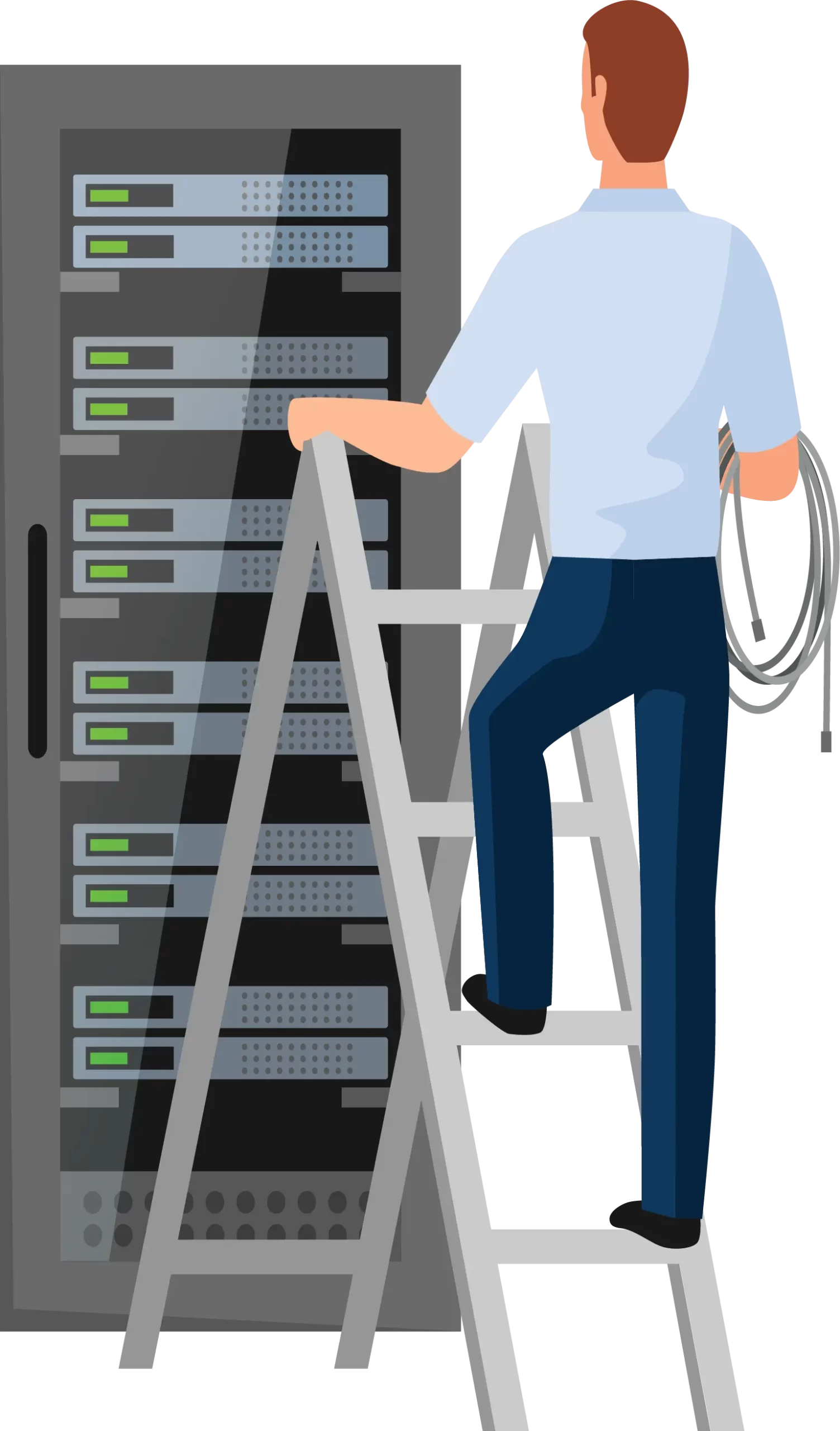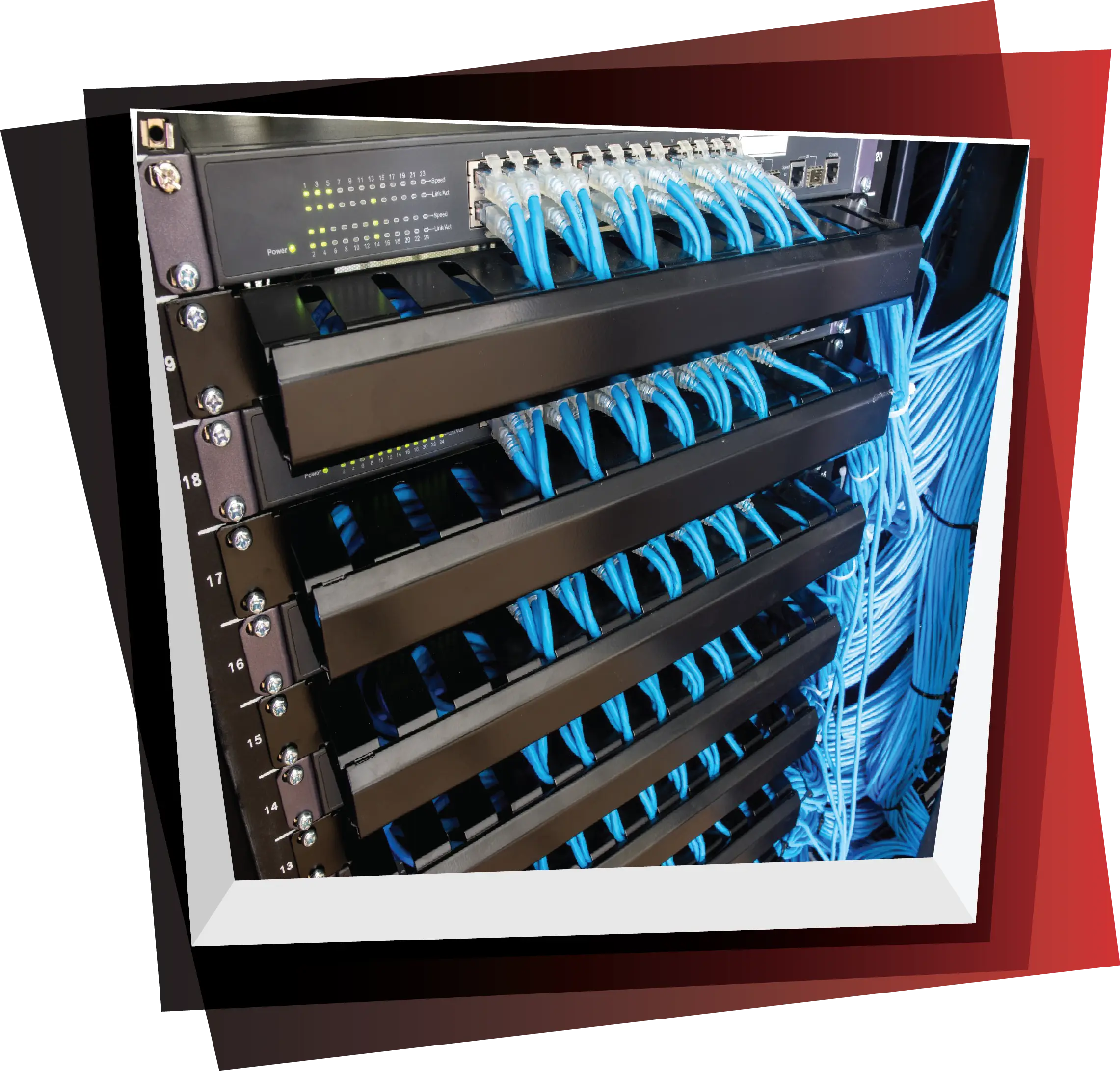 تثبيت الراك وهو المكان الرئيسة لكي يتم فيه تجميع الشبكة حيث يحتوي علي السويتشات والباتش بانيل ويتم تنظيم الشكل النهائي للكابلات لكي يظهر بشكل انيق